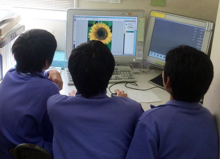職場体験二日目。 昨日は、自分たちで用意してきた画像をスキャンして取り込み、加工するところまでの体験でしたが、今日は、その画像を配置して、来年度のカレンダーと、メモ帳の表紙のデザインなど、DTPを体験してもらいました。
