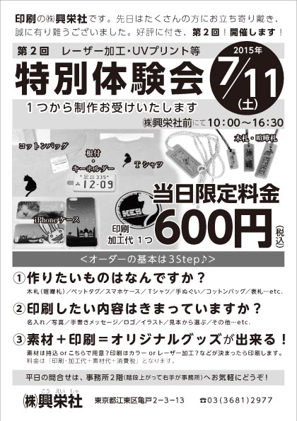 先月の好評を受け、今月もレーザー加工・UVプリント等の特別体験会を開催しました。体験会特別お試し料金にて、UVプリントやレーザー加工をお試しいただく機会となっております。