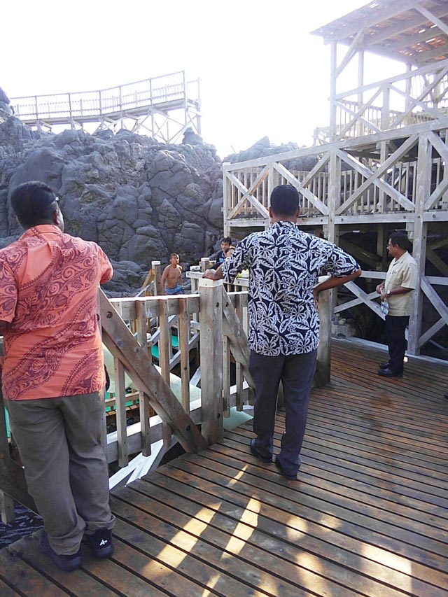 私達一行は、東京竹芝桟橋を朝7時35分発のジェット船で出航し、10時40分に神津島に到着しました。宿泊先である民宿「だいじんこ」で一旦休憩をした後、村役場で当時の浜川謙夫村長を初めとする職員の歓迎を受け、村長室で対談。村長から「チューク州のウエノ島は神津島より人口は多いが、島の大きさがほぼ同じで、とても近い存在に感じます。今回の視察で島内のインフラをどのように活用しているのかを参考にしてください。」と挨拶がありました。その後、東京電力発電所・漁協・診療所・図書館・学校・観光協会・赤崎遊歩道と視察し、宿で入浴後、村長主催の夕食会に招かれました。