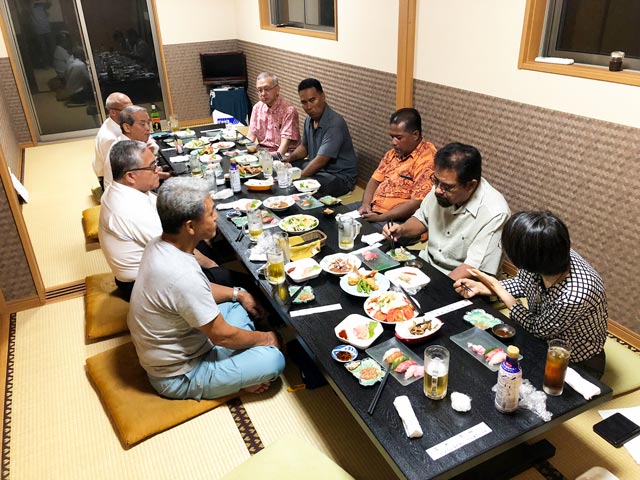 夕食会は「山長」で催され、視察団のナカヤマ氏・ロバート氏から「漁協で見た金目鯛の大きさを自動分別する装置の効率の良さに驚きました。また、出荷の際に、大量な氷を使う事に関して、その氷が料金にも含まれることを知り、遠方への流通が可能になることも理解できました。私たちの国では、氷は付録であり、料金が掛かるという習慣は有りません。そのため、島内での流通が殆どとなります。」「道路の整備は素晴らしいとは思いますが、ウエノ島ではでこぼこした夜道を走っている車を見ると、まっすぐ走っているのは酔っ払い、でこぼこを避けて蛇行して走っているのが真面な運転。」といったジョーク交じりの挨拶があり、参加者の笑いを誘っていました。村長からは「チューク州では腎臓病になったとき、透析治療のために設備の整った病院のある島に渡ると聞きました。そしてその移動の時がお別れの時との考えがあると聞きました。しかし、透析をするために家族と別れることは良くありません。家族と一緒に透析治療をしてください。そのためには、ダイアライザーを利用する方法がありますから、是非若い皆さんの力で導入できるよう進めてください」と感動的な施策提案の話がありました。早朝からの移動と、休みないスケジュールでの視察疲れは有りましたが、神津島ならではの海産物を食べ、地元の焼酎盛若を飲みながら夕食会が終始楽しく終わることができました。