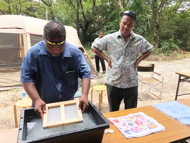 視察二日目は、郷土資料館・下水道施設・農地・空港を視察し、三浦湾展望台・三浦漁港と回り、弊社が行っている島内で間伐した桑の枝から作る和紙の紙漉き体験を行いました。その後ジュリアの十字架、船場、多幸湧水を見学し、最後に再び村役場に戻り意見交換会を行いとても充実した視察ができたとの喜びの声を聞くことができました。